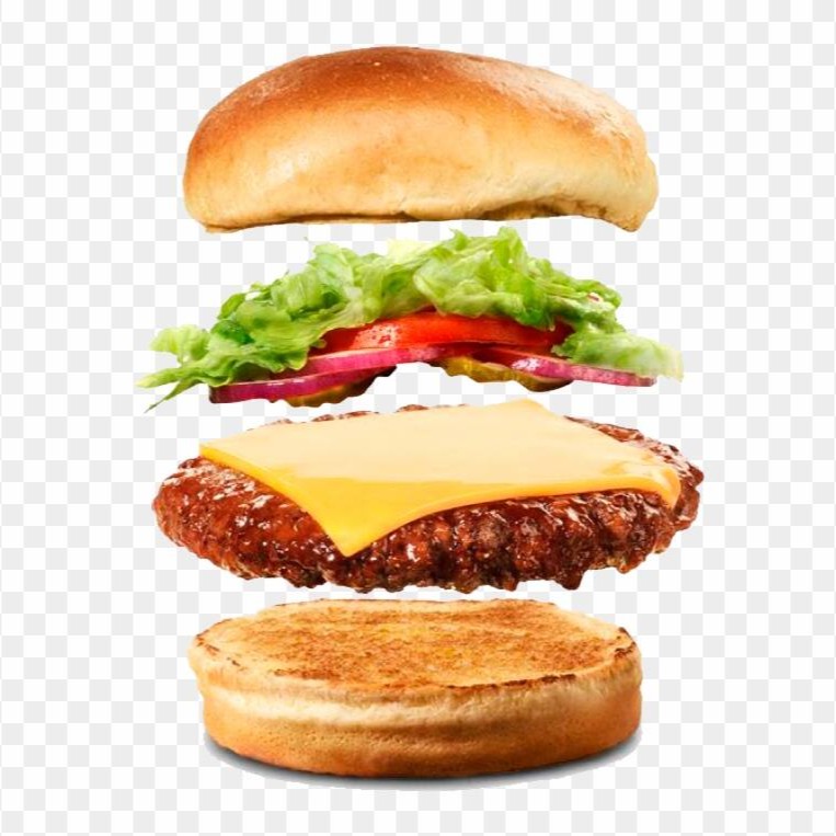 -pão, carne de hambúrguer, queijo mussarela e maionese.