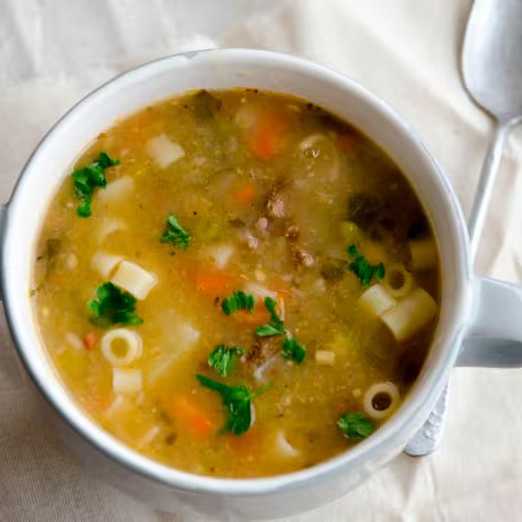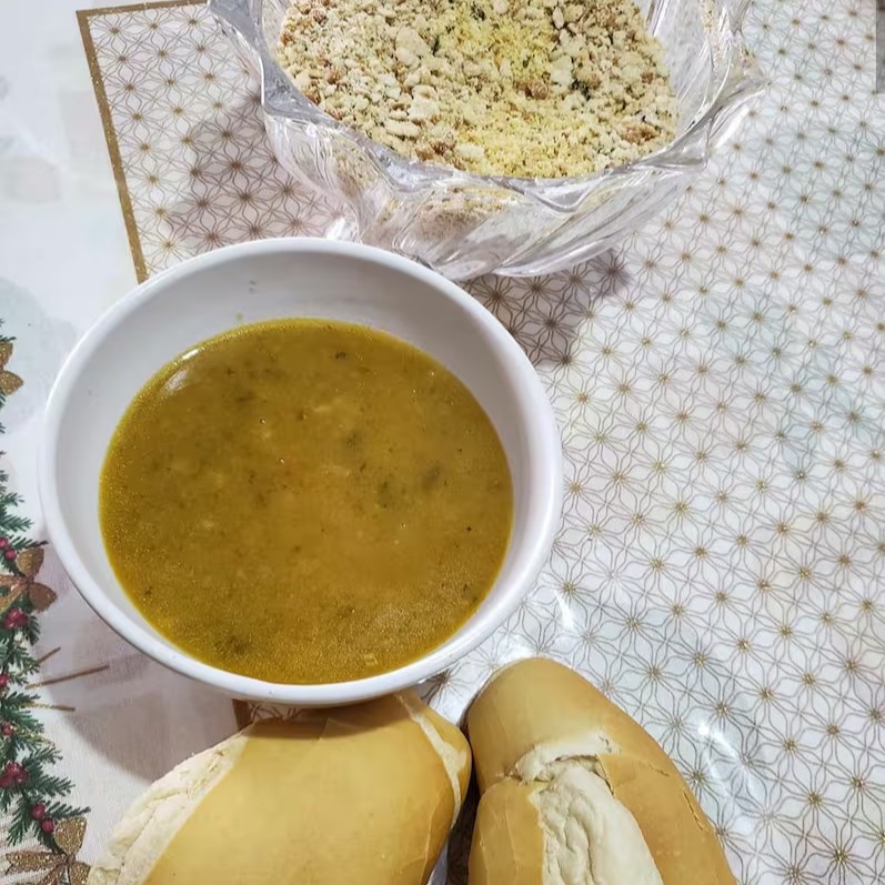-Sopa de legumes com pedaços de carne de jabá;
