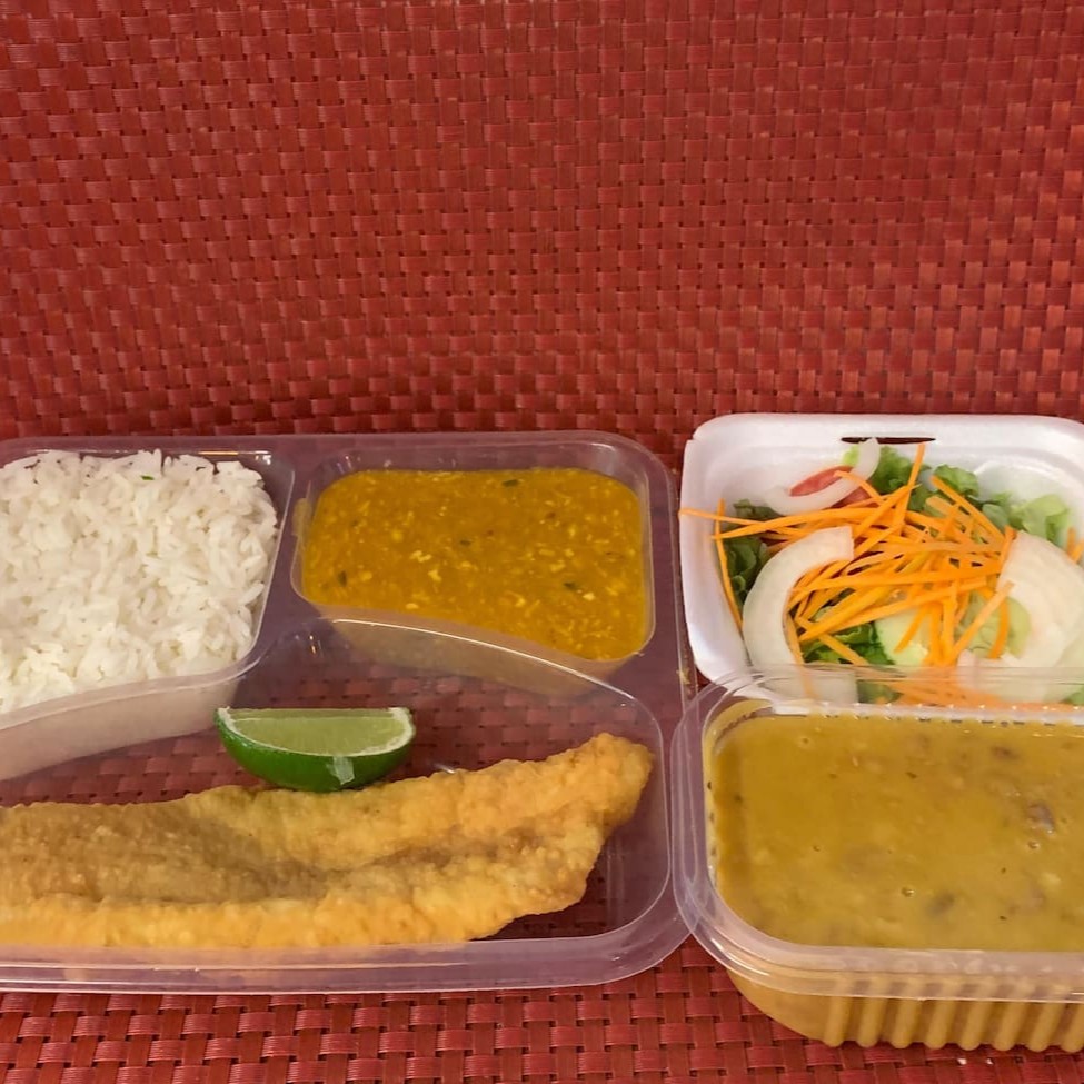 Acompanhamentos: arroz branco, pirão de peixe e farofa de banana
