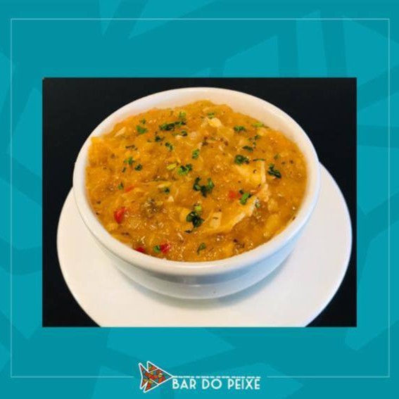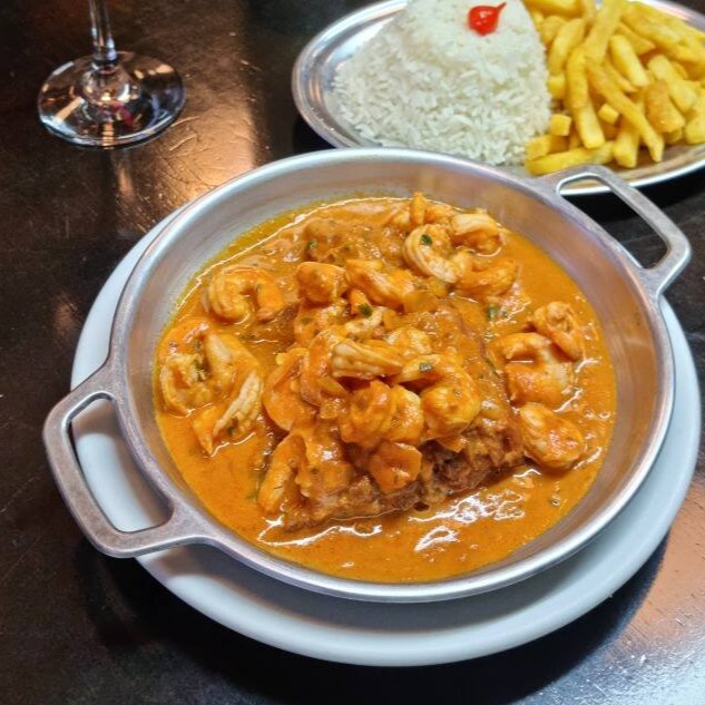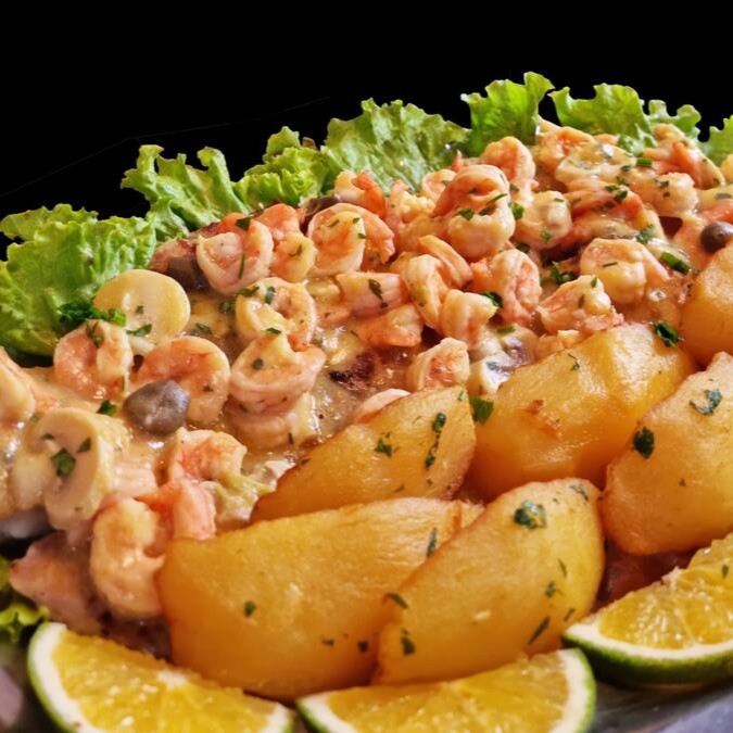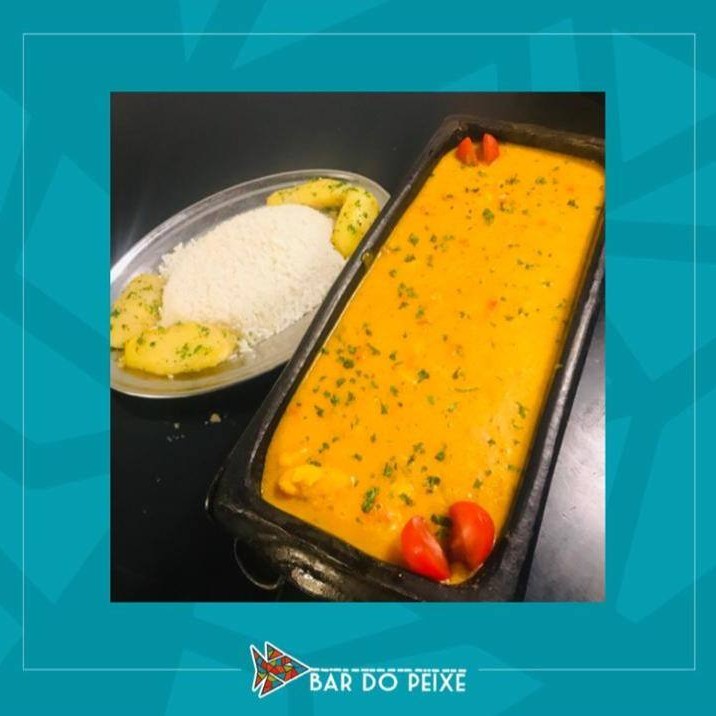Pirarucu, camarão, pimentão, cebola, tomate refogado no azeite com leite de coco, creme de leite, arroz branco e batata soutê. Serve 2 pessoas.