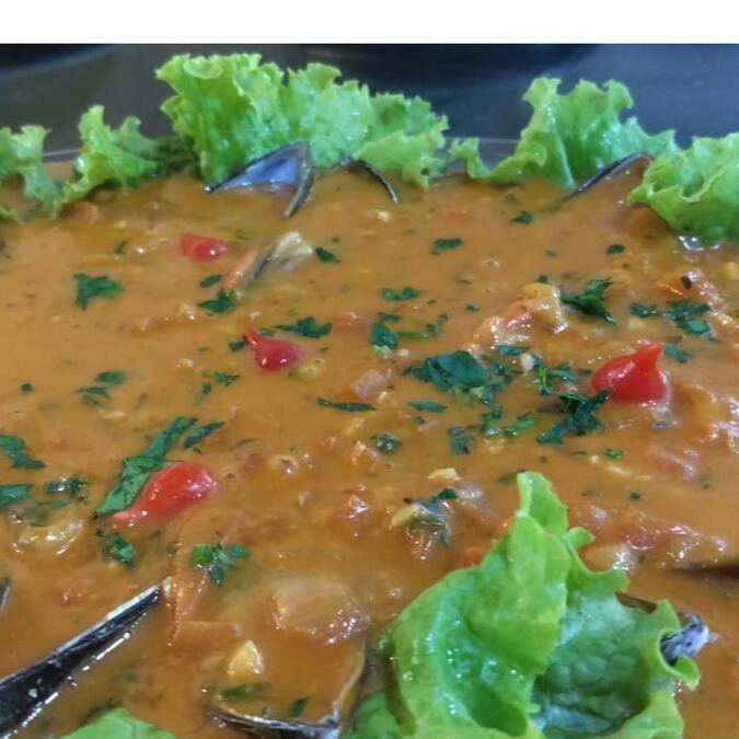 Marisco na casca, com molho de tomate refogado com alho, cebola, leite de coco, e tomate e cebola picado por cima dos mariscos.