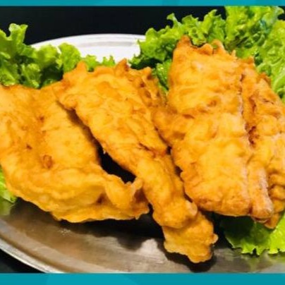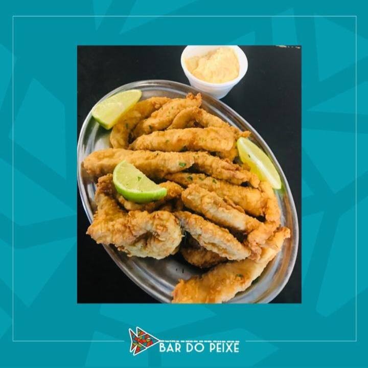 Filé de tilápia cortado em tiras, empanado e frito.