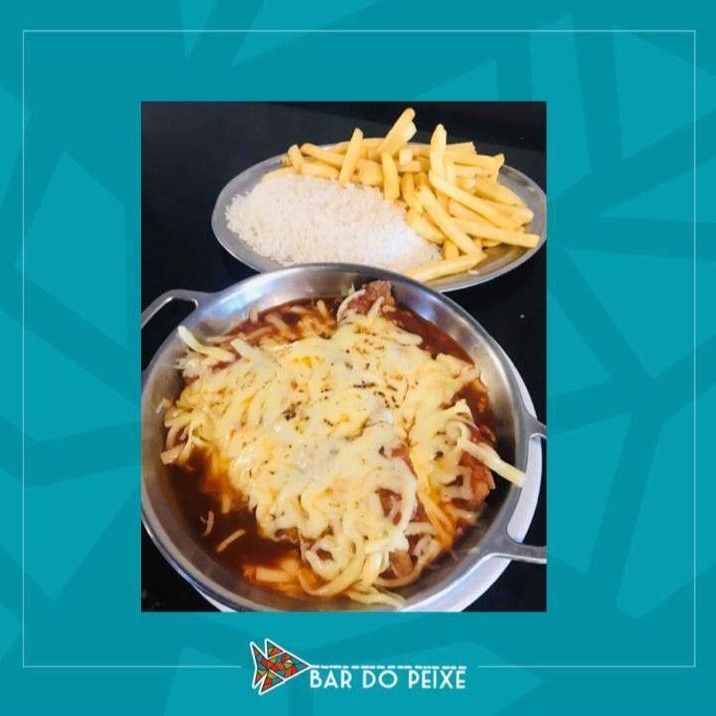 Filé de peixe frito com molho de tomate, mussarela, arroz branco e fritas.