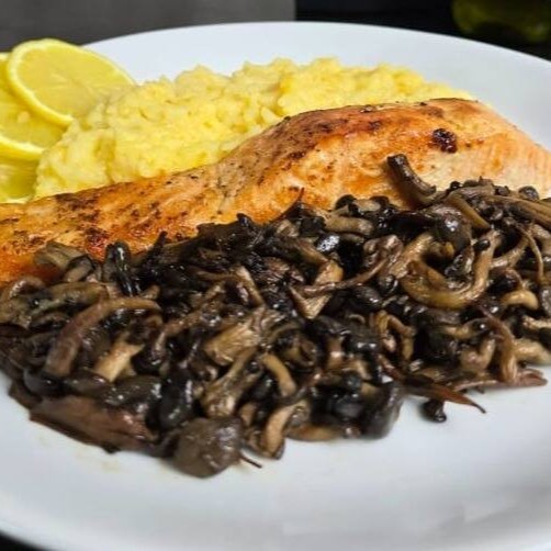 Filé de Salmão grelhado, shimeji na manteiga e risoto de limão siciliano. Serve 1 pessoa