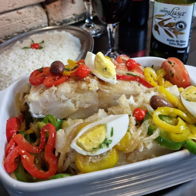 Nosso sublime 'Bacalhau à Portuguesa' é um verdadeiro deleite para os apreciadores de um bom peixe. O bacalhau, meticulosamente grelhado, une-se harmoniosamente às batatas suculentas e à cebola cuidadosamente selecionada, trazendo uma explosão de sabor inesquecível. O tomate fresco, o pimentão crocante e as azeitonas pretas intensificam o paladar, enquanto o ovo cozido adiciona uma textura rica e interessante. Servido com arroz branco perfeitamente cozido, este prato é uma verdadeira homenagem à culinária portuguesa, garantindo uma refeição saborosa e satisfatória.