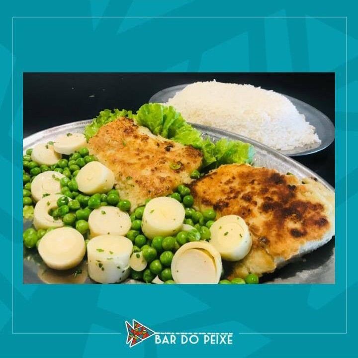 Filé grelhado, arroz branco, palmito e ervilha na manteiga.