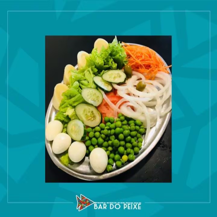 Alface, tomate, cebola, palmito, ervilha, cenoura,pepino, ovo de codorna e azeitona.