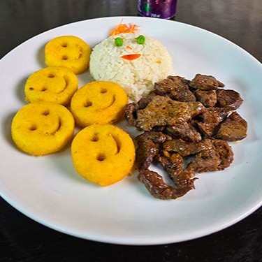 Isca de filé mignon ou isca de tilápia,com batata smile e arroz branco.(Iscas ,filé cortado em tiras!)