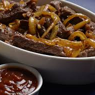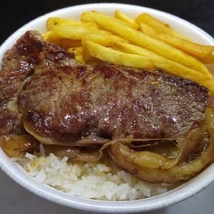 Porção de contra filé acebolado com pão francês (grande), serve de 3 a 4 pessoas.