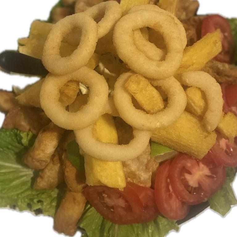 Acompanham: Mandioca frita e anéis de cebola.