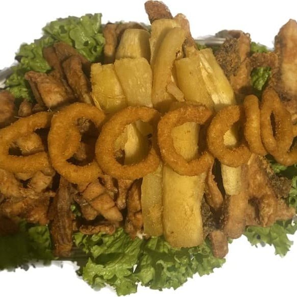 Peixe tilapia Frita inteira bem sequinha todas as porções acompanham mandioca frita e anéis de cebola.