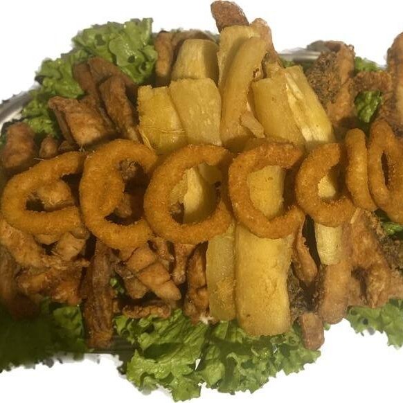 Acompanha: Mandioca frita e anéis de cebola.