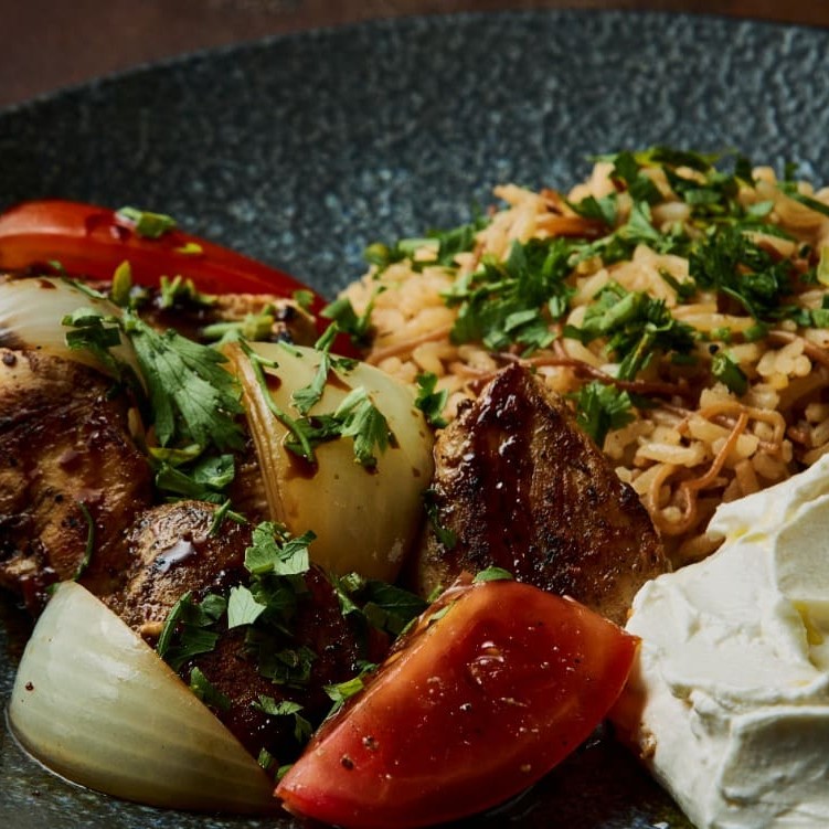 Frango marinado e grelhado (michui), servido com arroz com aletria e coalhada seca cremosa. Uma combinação equilibrada de sabores e texturas.