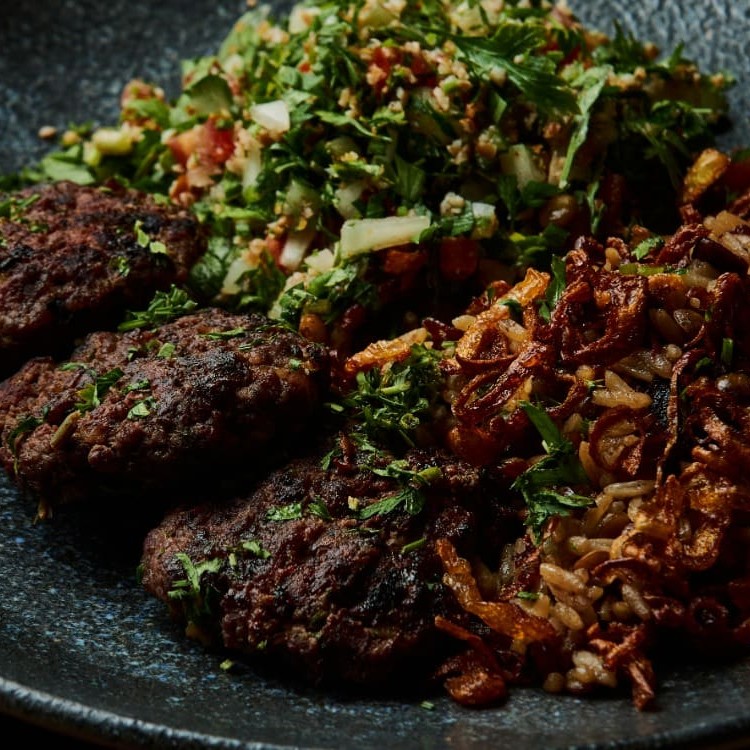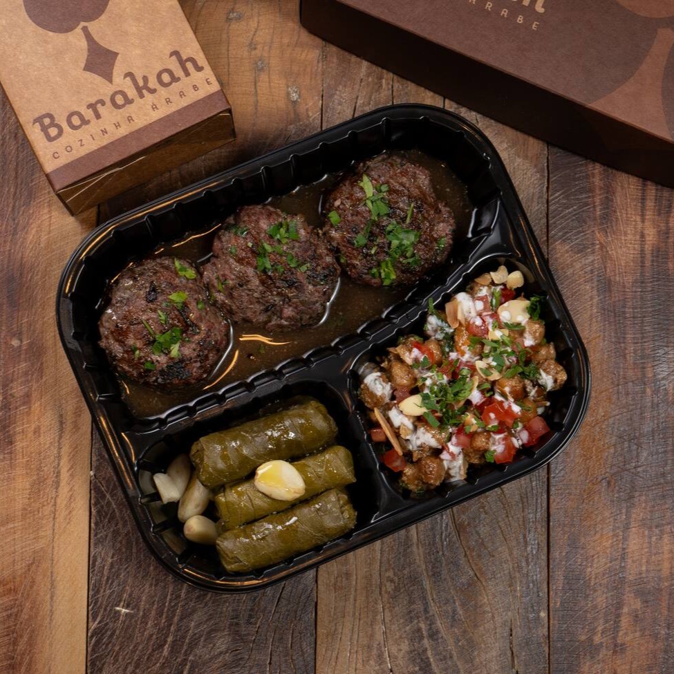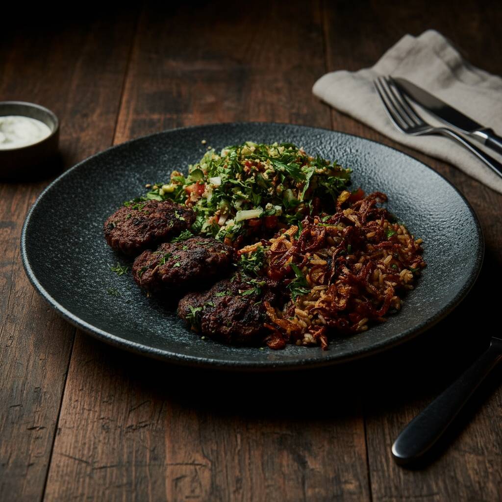 Três unidades de kafta preparadas com temperos especiais, acompanhadas por arroz com lentilha ou aletria e um tabule fresco. Uma combinação equilibrada e autêntica.