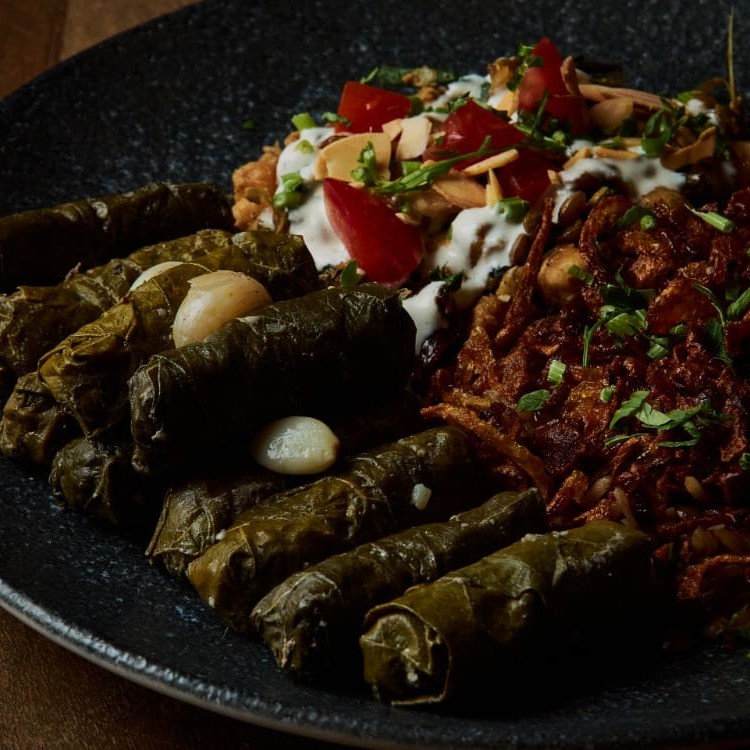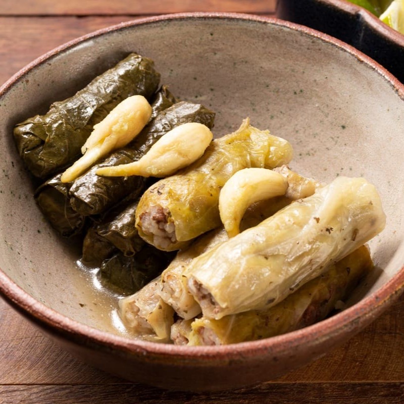Folhas de uva cuidadosamente enroladas, acompanhadas por arroz com lentilha saboroso e uma salada de grão-de-bico leve e refrescante. Uma experiência completa e inesquecível.