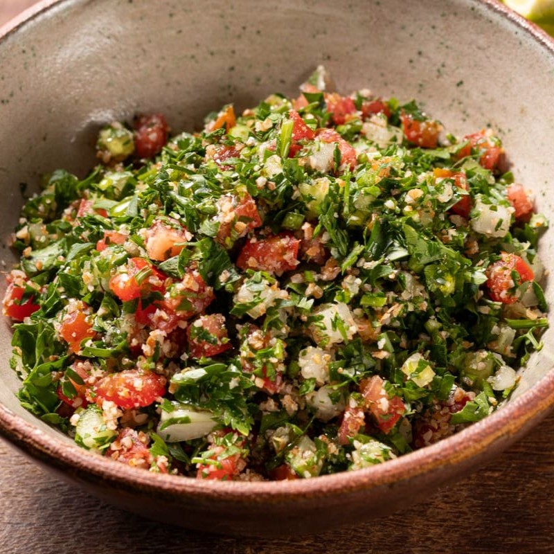O 'Tabule' é uma tradicionalíssima e vibrante salada árabe, repleta de sabores frescos e texturas contrastantes. A base dessa delícia é uma generosa quantidade de salsinha, que traz um toque de verde e frescor ao prato. Tomates suculentos, pepinos crocantes e cebolas finamente picadas adicionam cor e variedade no paladar. O trigo moído, por sua vez, confere uma textura única, tornando a experiência ainda mais agradável. Para finalizar, a salada é habilmente temperada com limão, azeite e sal, proporcionando um equilíbrio perfeito entre o ácido, o salgado e o untuoso. Uma opção leve, saudável e saborosa para qualquer momento do Dia.