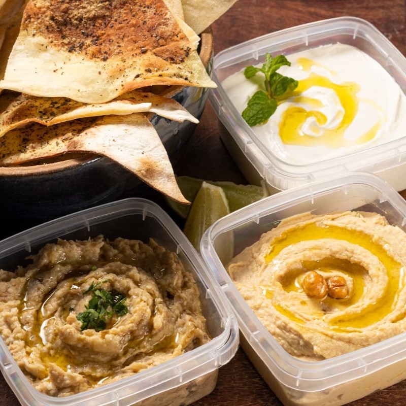 Inclui 150g de coalhada, 150g de homus e 150g de babaganush, 8 esfihas fechadas, 4 esfihas abertas e 4 quibes fritos (50g cada).