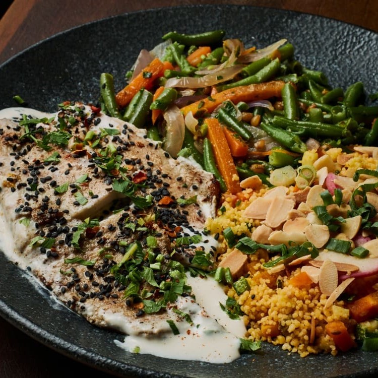 Filé de saint peter grelhado no ponto, coberto com molho taratour à base de tahine, limão e azeite. Acompanha couscous marroquino e salada de vagem fresca. Uma refeição equilibrada, leve e marcante.