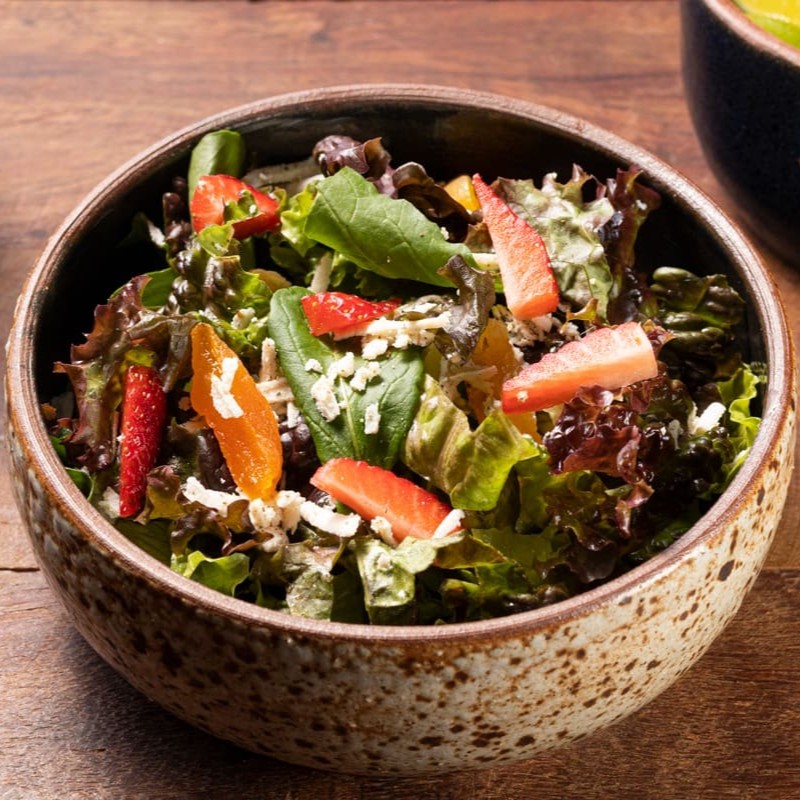 Desfrute da nossa 'Salada Tafadalu', um prato exuberante da categoria 'Saladas e Pastas'. Este prato vibrante combina um mix de folhas frescas e crocantes, damascos secos que proporcionam um toque doce e frutas da estação para um sabor fresco e natural. Acrescentamos ricota cremosa com zaatar, que oferece uma textura suave e um sabor que desperta o paladar, e nozes para um toque adicional de crocância. Finalizamos com o nosso delicioso molho caseiro, uma mistura equilibrada de aceto balsâmico e mel, para dar o toque final nesta salada vegetariana irresistível.