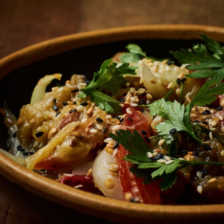 A 'Salada de Berinjela' é uma sinfonia de sabores e cores que encanta a todos. Com berinjelas assadas meticulosamente e desfiadas à mão, combinadas com tiras de tomates maduros e cebolas, a experiência é uma explosão de sabores. As azeitonas pretas adicionam um toque mediterrâneo inconfundível ao prato. Tudo é harmoniosamente temperado com azeite de oliva de alta qualidade, suco de limão fresco, salsa vibrante, sal equilibrado e gergelim torrado. Este prato é não só ideal como uma salada refrescante e nutritiva, mas também se destaca como uma entrada elegante em qualquer refeição.