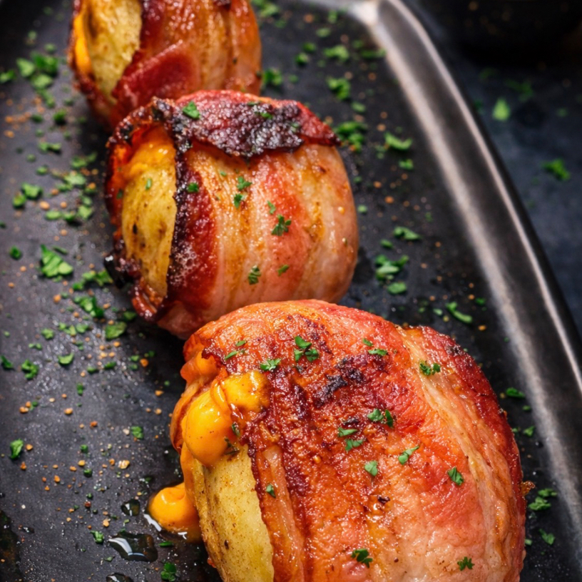 Batata bolinha recheada com cheddar e envolvida com uma generosa camada de bacon e assada na brasa