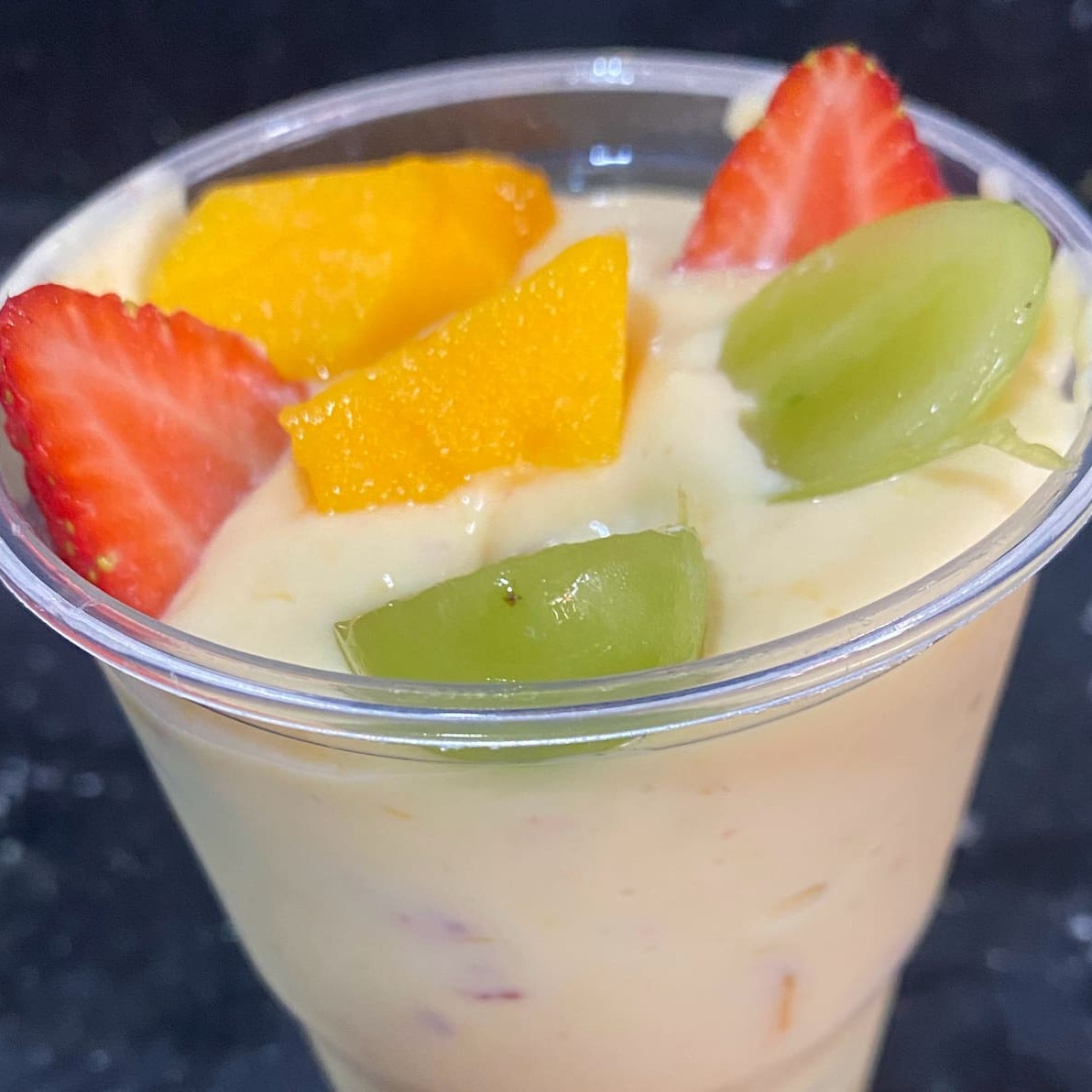 Manga, uva ,morango e banana coberto com Mousse de Maracuja