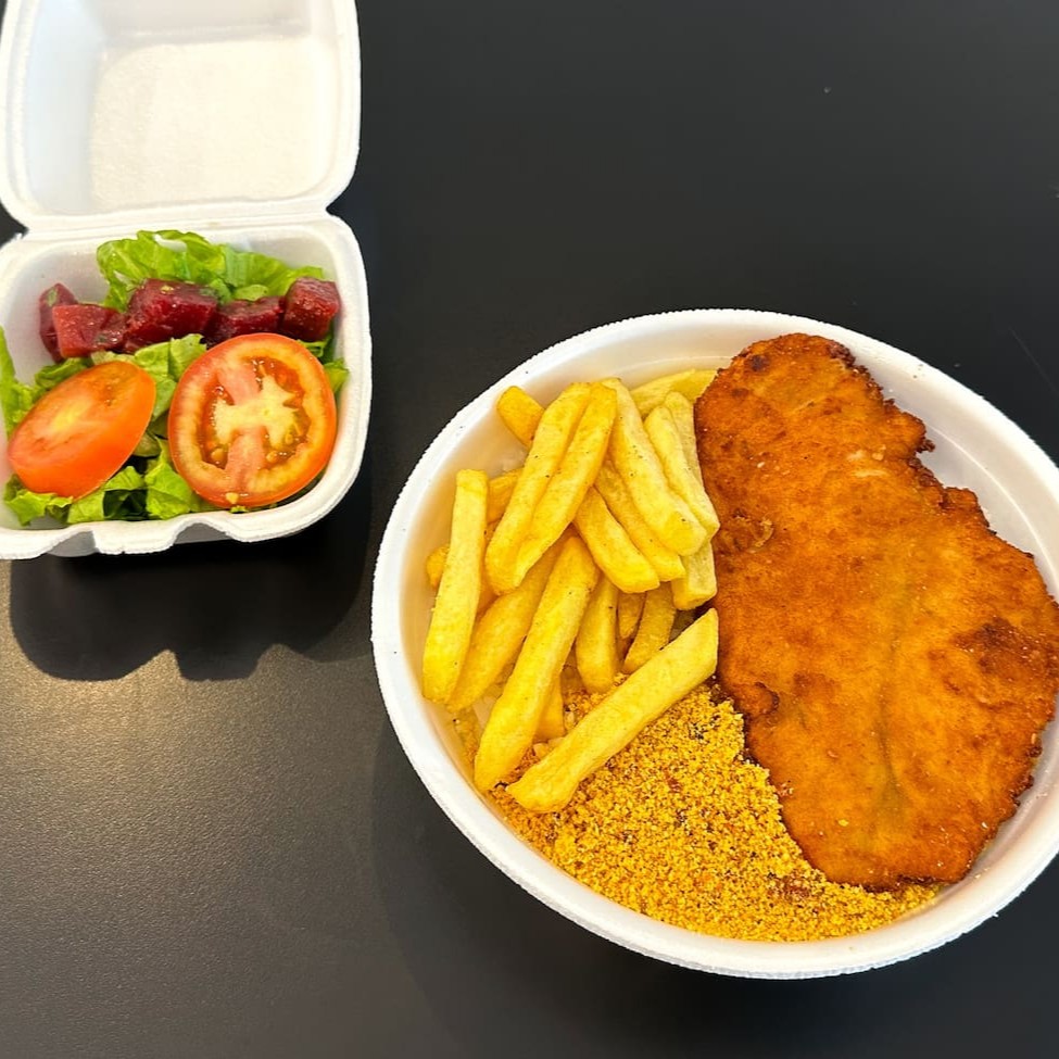 Filé de frango a milanesa acompanhado de arroz, feijão carioca, batata frita, farofa e salada de alface e tomate.