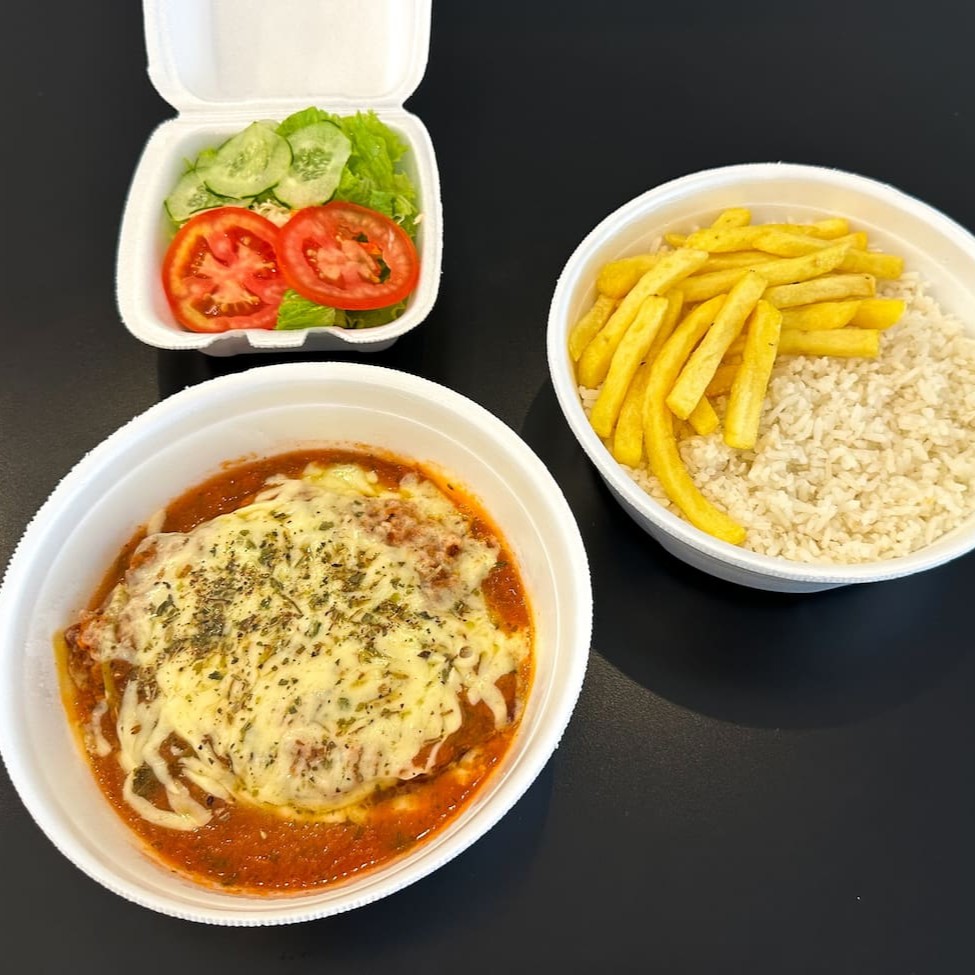 Frango a parmegiana com nosso molho de tomate artesanal acompanha separadamente arroz, feijão carioca, farofa, batata frita e salada de alface e tomate.