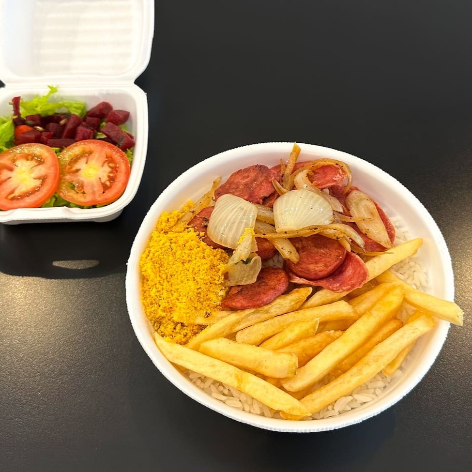 Calabresa acebolada acompanha arroz, feijão carioca, farofa, batata frita e salada de alface e tomate.