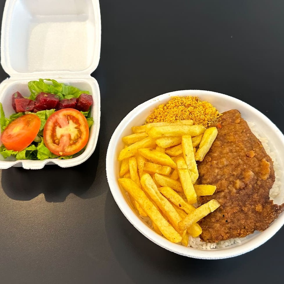 Bife à milanesa acompanha arroz, feijão carioca, farofa, batata frita e salada de alface e tomate.