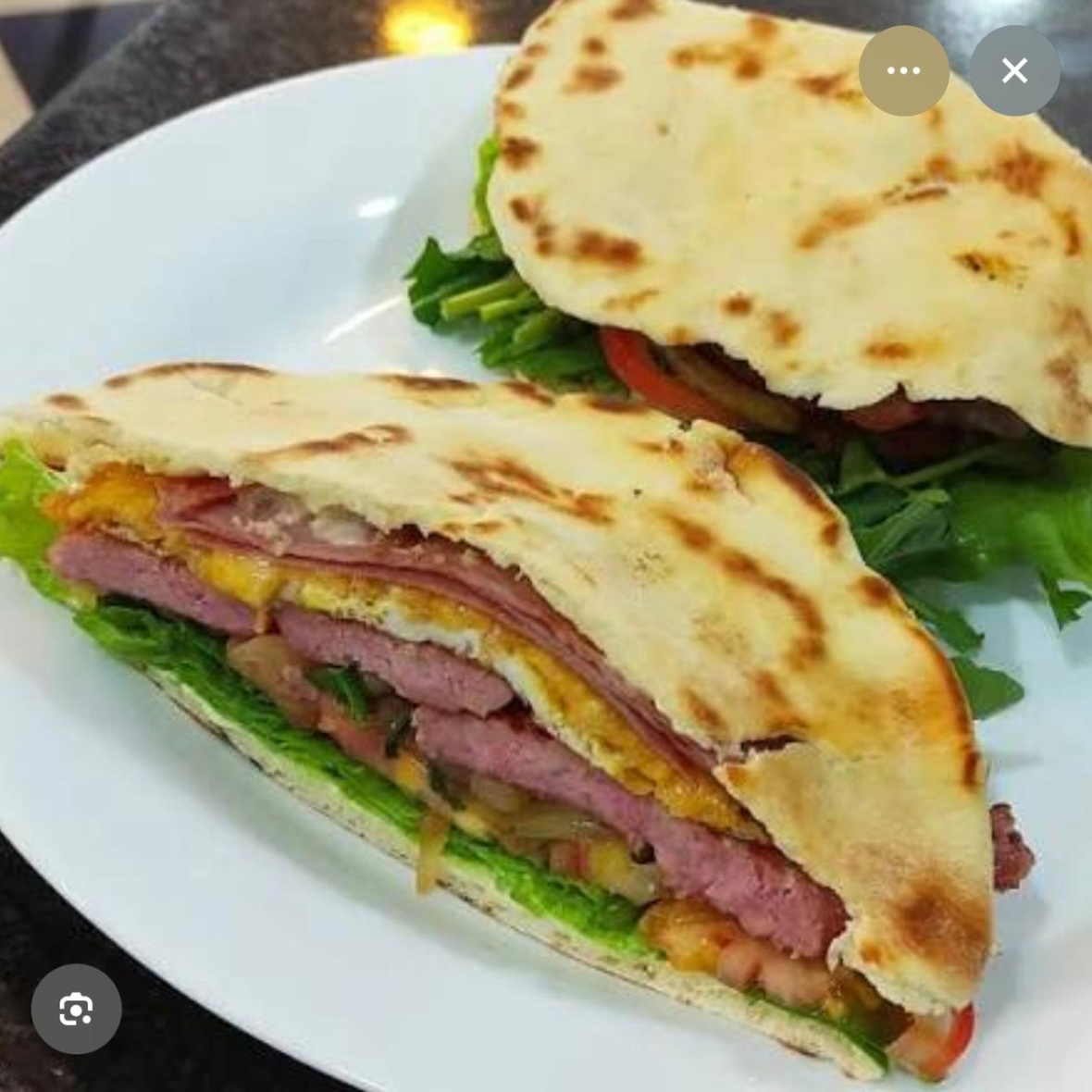 (FATIAS DE CONTRA FILÉ, QUEIJO, ALFACE, TOMATE E MAIONESE NO PÃO SÍRIO)