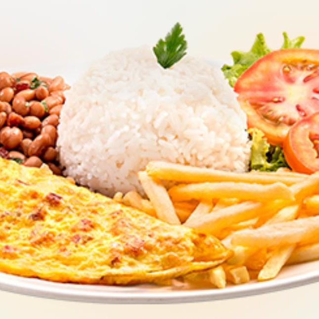 (OMELETE, ARROZ, FEIJÃO, SALADA E FAROFA).