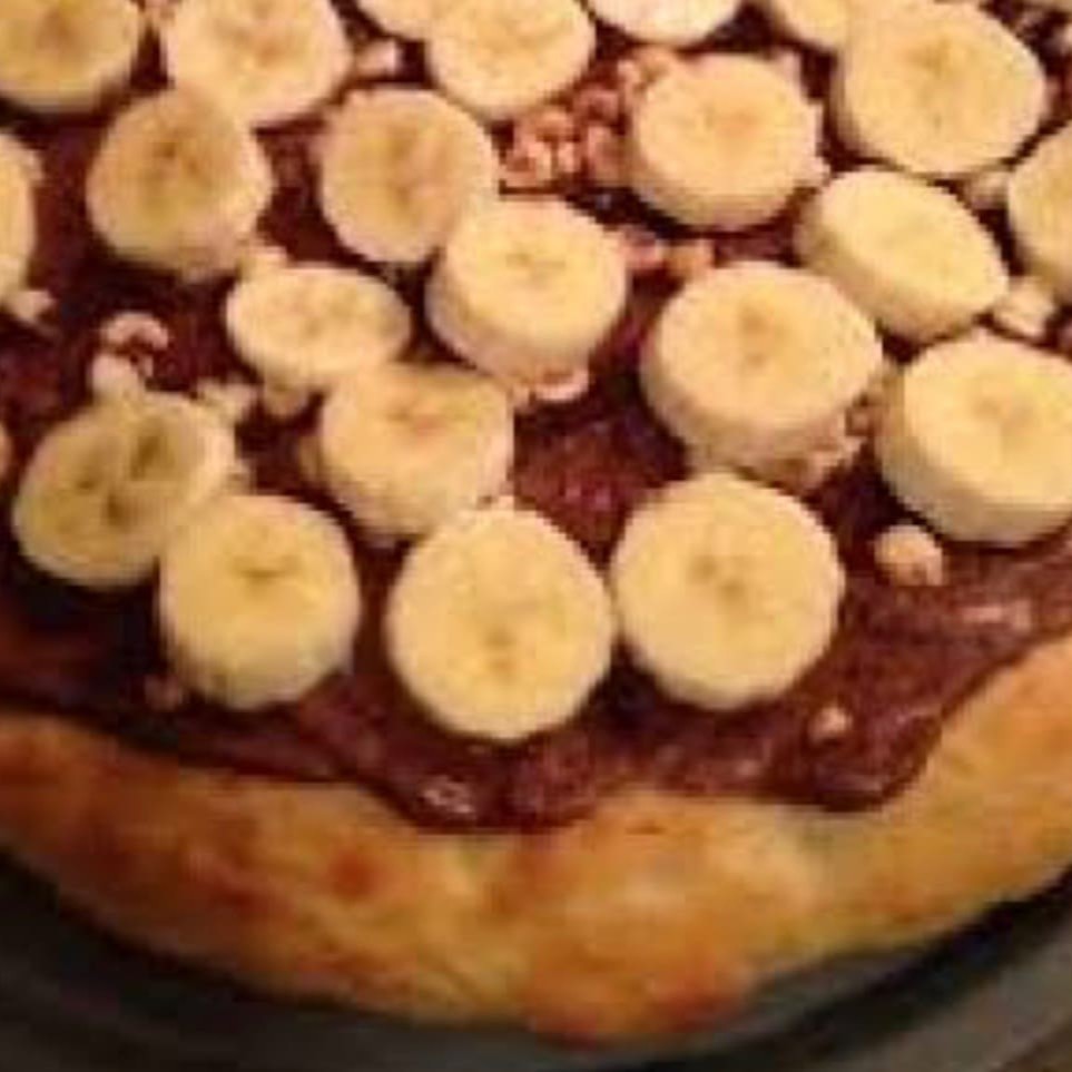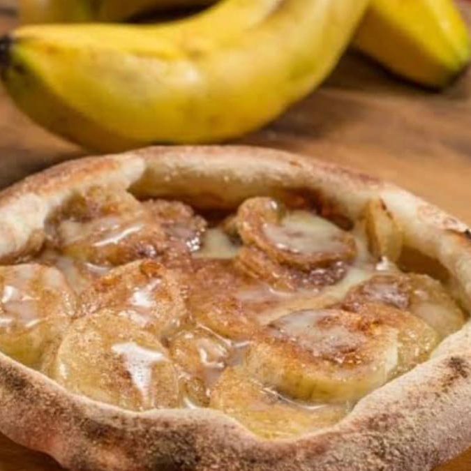 Pizza Doce Premium! Feita com Chocolate Branco, Creme de Leite, Leite Condensado e Banana! A Pizza é Flambada e fica M A R A V I L H O S A!