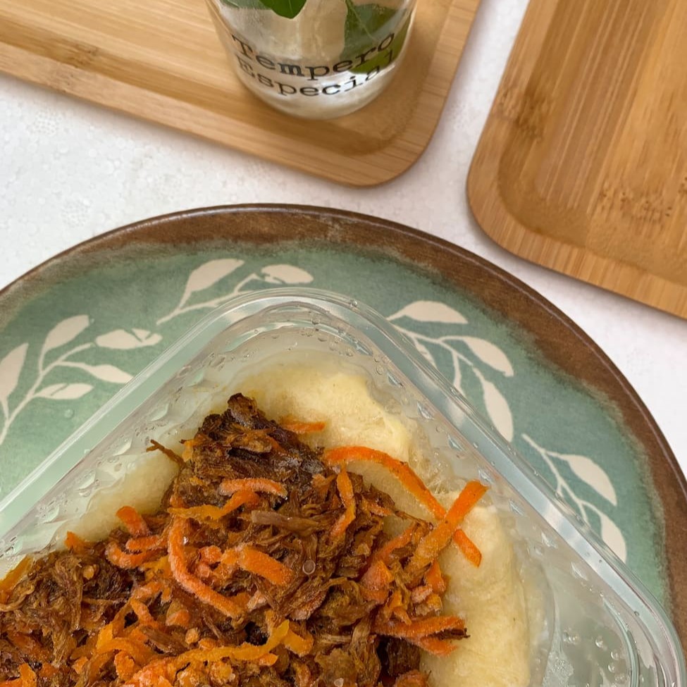Apresentamos nosso Ragu de Carne: suculenta carne desfiada, lentamente cozida em um rústico molho de tomate e pimentões. O prato é harmoniosamente acompanhado de um encantador e cremoso purê de batatas , delicadamente temperado com sal, noz-moscada e pimenta-do-reino. Nutritivo e de sabor inigualável, esse prato é a expressão da culinária saudável feita com dedicação e carinho. Em nossa cozinha,