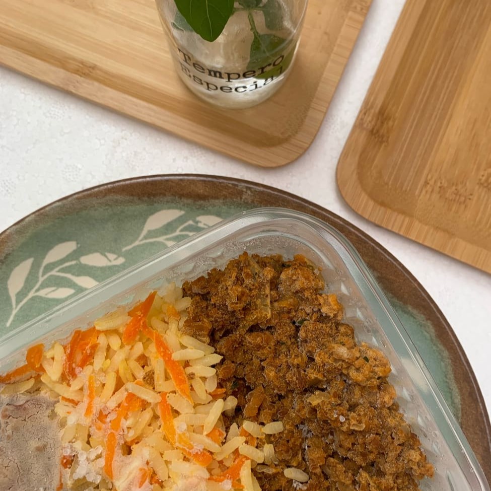 Saboreie a inigualável 'Carne moída, feijão carioca e arroz com cenoura', uma proposta culinária irresistível, repleta de prazer gastronômico. Este prato expressa a autêntica essência da carne moída, cuidadosamente temperada, perfeitamente harmonizada com o suculento feijão carioca e o arroz enriquecido com cenoura, conferindo um toque leve e saudável à composição. Evitando temperos industrializad
