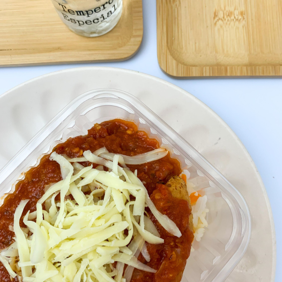 Descubra o prazer de saborear nosso delicioso 'Frango em Cubos, Arroz com Cenoura e Feijão Preto'. Este prato é uma combinação harmoniosa de frango suculento em cubos, habilmente cozido em um robusto molho de tomate, acompanhado de arroz divinamente temperado com cenoura, o feijão preto adiciona um toque final de sabor, conferindo equilíbrio ao prato. Em nossa cozinha, onde cada ingrediente é esc