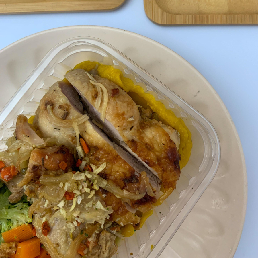 Delicioso filé de sobrecoxa assada, purê de abóbora e legumes