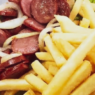 Batata Frita sequeinha + Calabresa fatiada dourada na chapa com cebola refogada. Porção saborosa e perfeita para petiscar. Aprox. 350 gr (imagem meramente ilustrativa