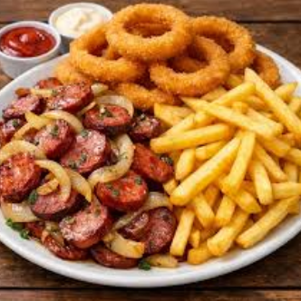 Calabresa fatiada dourada na chapa com cebola refogada + Batata Frita + Onion sequinha. Porção saborosa e perfeita para petiscar. Aprox. 400 gr (imagem meramente ilustrativa