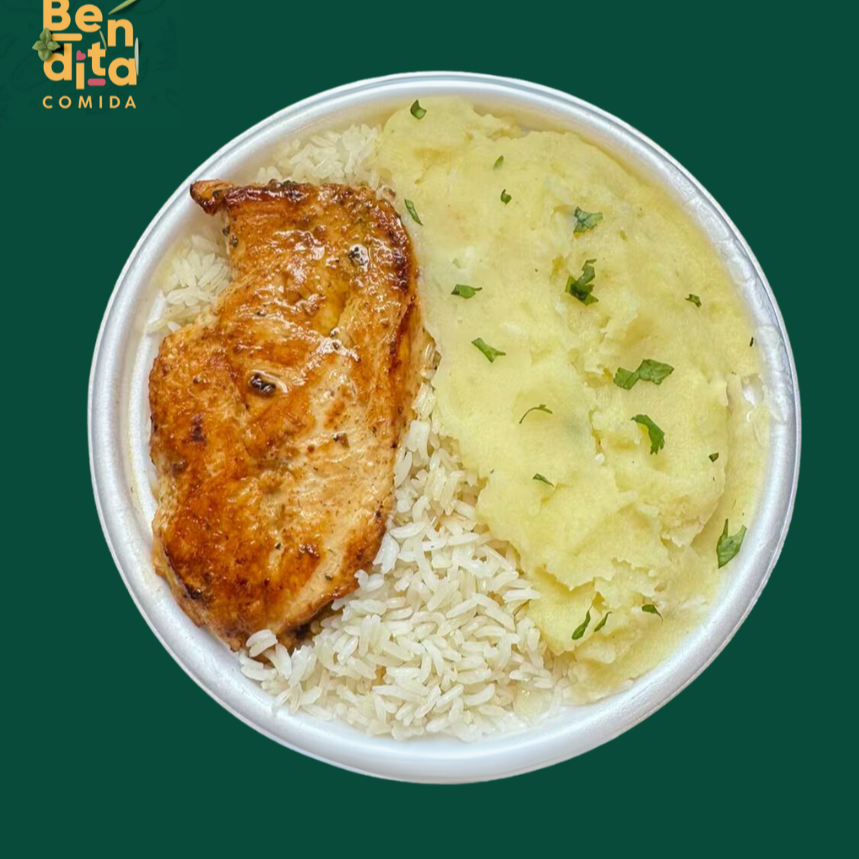 Marmita com delicioso filé de frango grelhado acompanhado de arroz branco, feijão e purê de batatas. Marmita indicada para 01 pessoa.