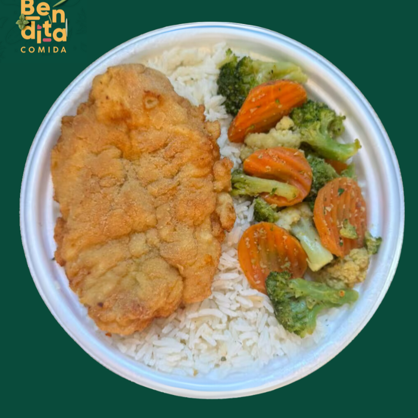 Marmita com delicioso filé de frango empanado na massa crocante acompanhado de arroz branco, feijão e legumes cozido. Marmita indicada para 01 pessoa.