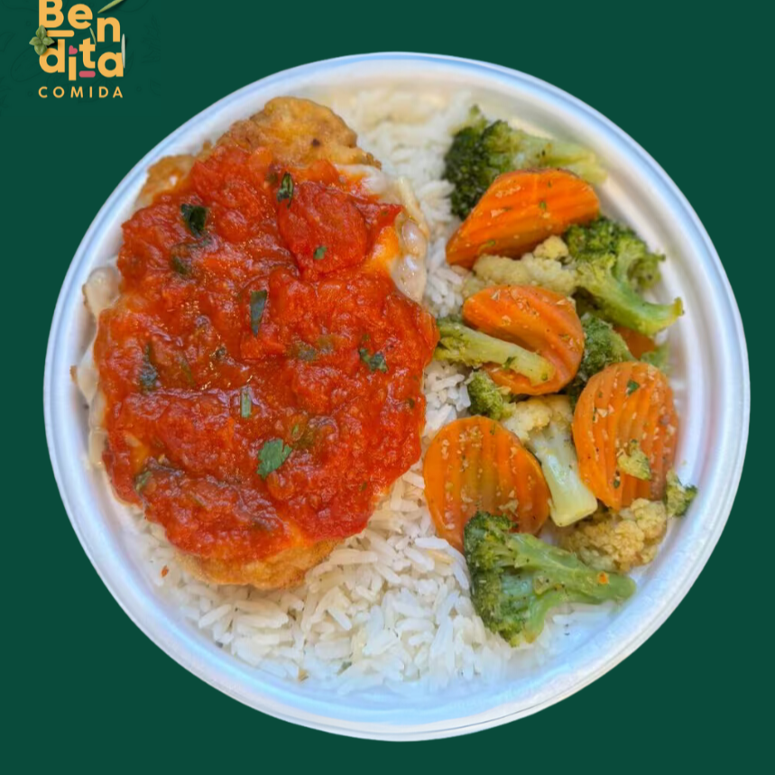 Marmita com delicioso filé de frango parmegiana (empanado na massa crocante coberto com molho de tomates e queijo) acompanhado de arroz branco e legumes cozidos. Marmita indicada para 01 pessoa.