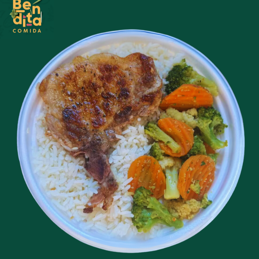 Marmita com deliciosa bisteca suína preparada com arroz branco, feijão e Legumes Cozidos. Marmita indicada para 01 pessoa.