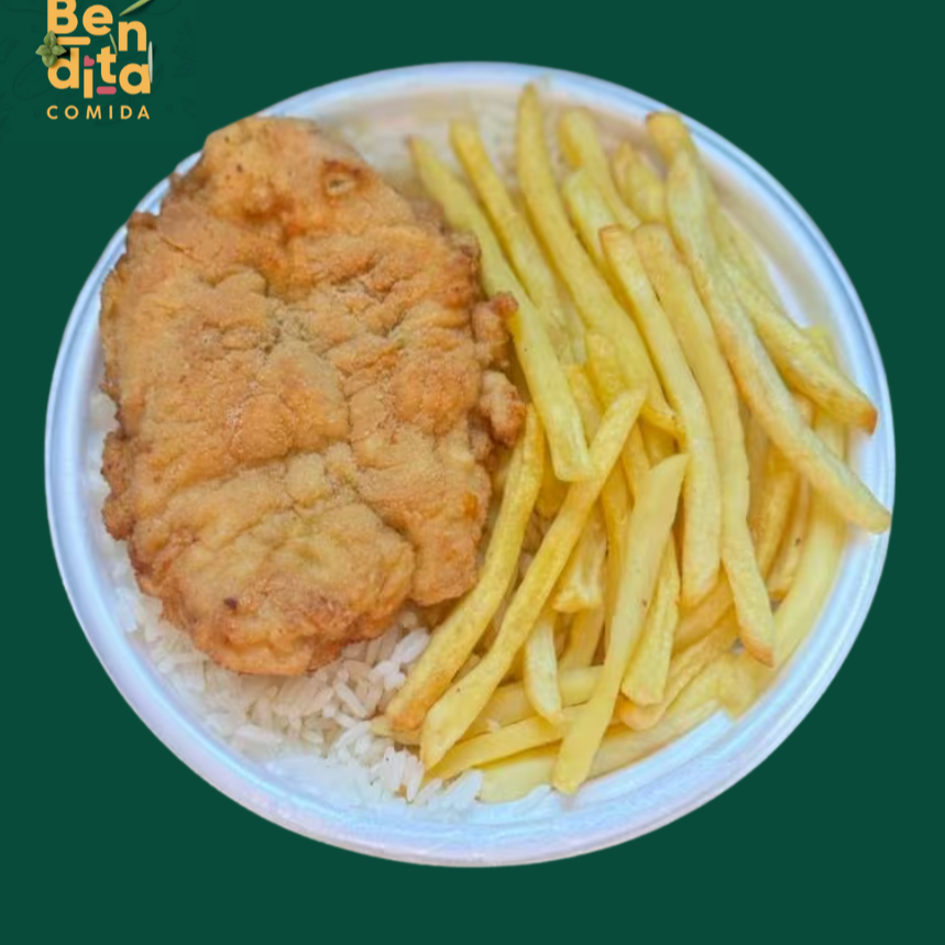 Marmita com delicioso filé de frango empanado na massa crocante acompanhado de arroz branco, feijão e batatas fritas. Marmita indicada para 01 pessoa.