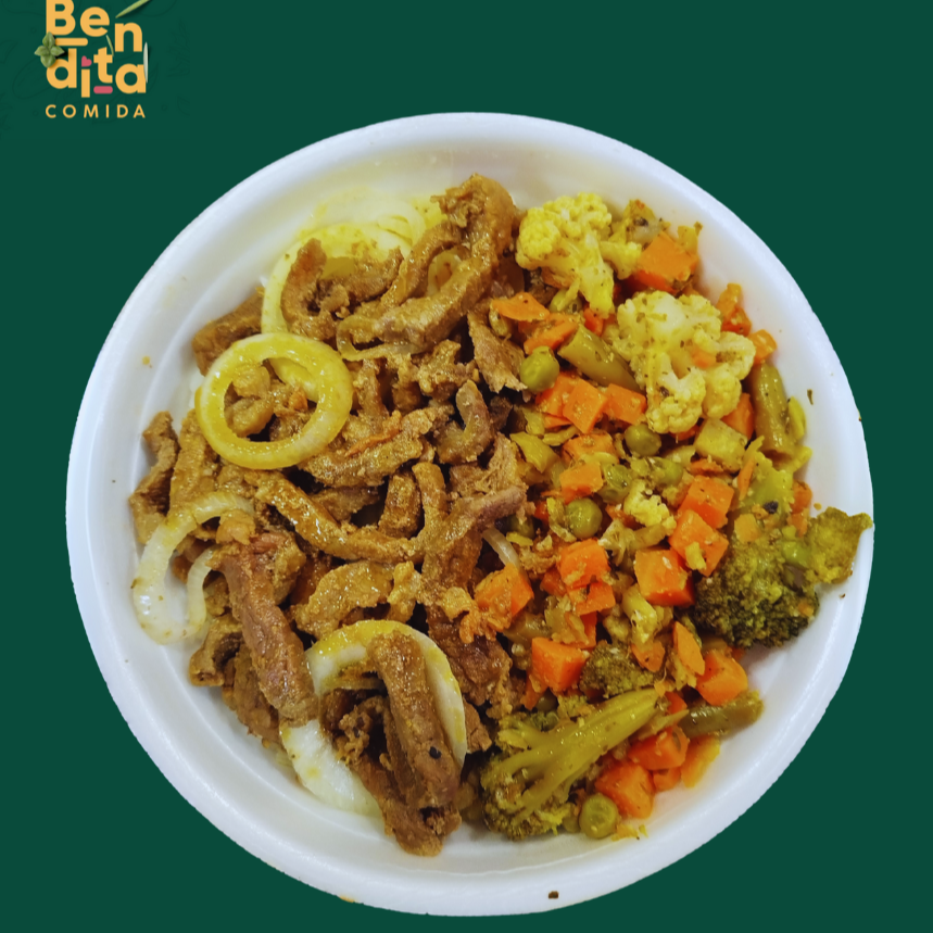 Marmita com deliciosas Iscas de Carne Acebolada acompanhada de Arroz Branco, Feijão E Legumes Cozidos. Marmita indicada para 01 pessoa.