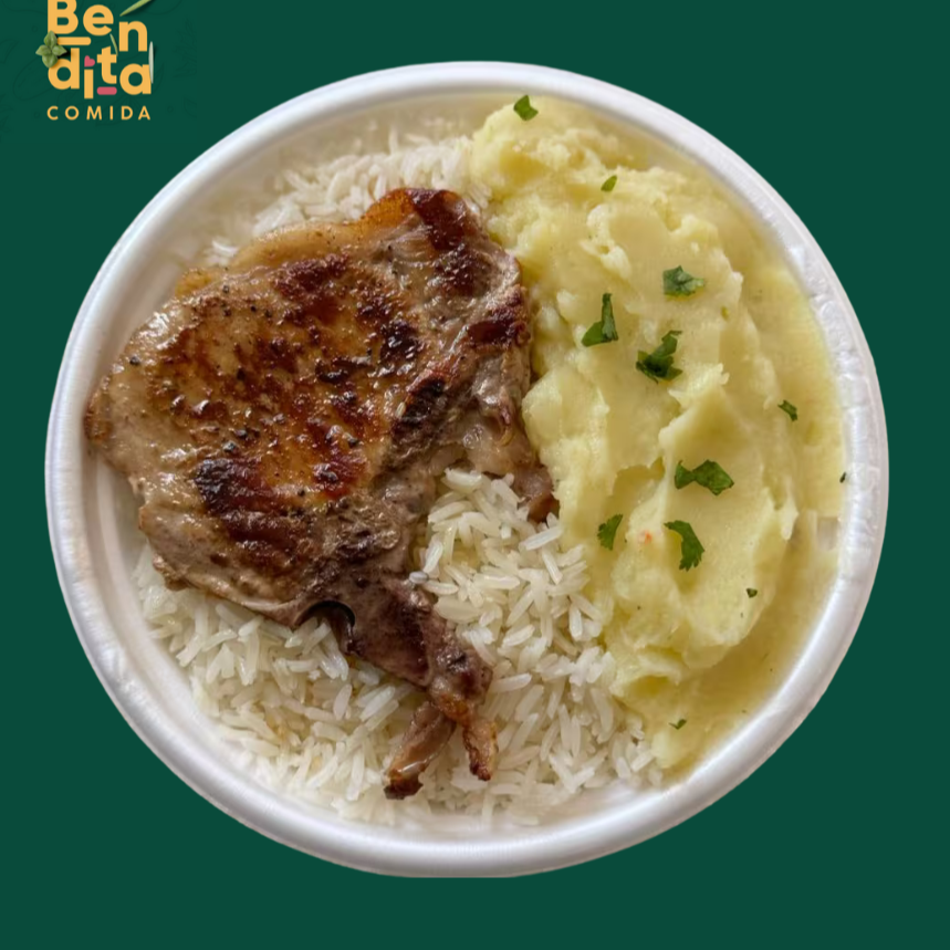 Marmita com deliciosa bisteca suína preparada com arroz branco, feijão e Purê de Batatas. Marmita indicada para 01 pessoa.