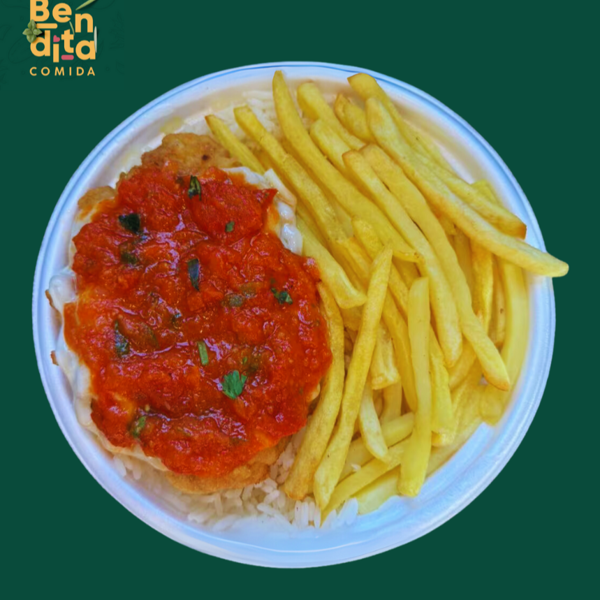 Marmita com um delicioso filé de frango parmegiana, empanado na massa crocante e coberto com molho de tomates fresco e queijo derretido. Acompanha arroz branco soltinho e batatas fritas crocantes. Uma refeição completa e saborosa, perfeita para satisfazer sua fome com todo o sabor e conforto!
