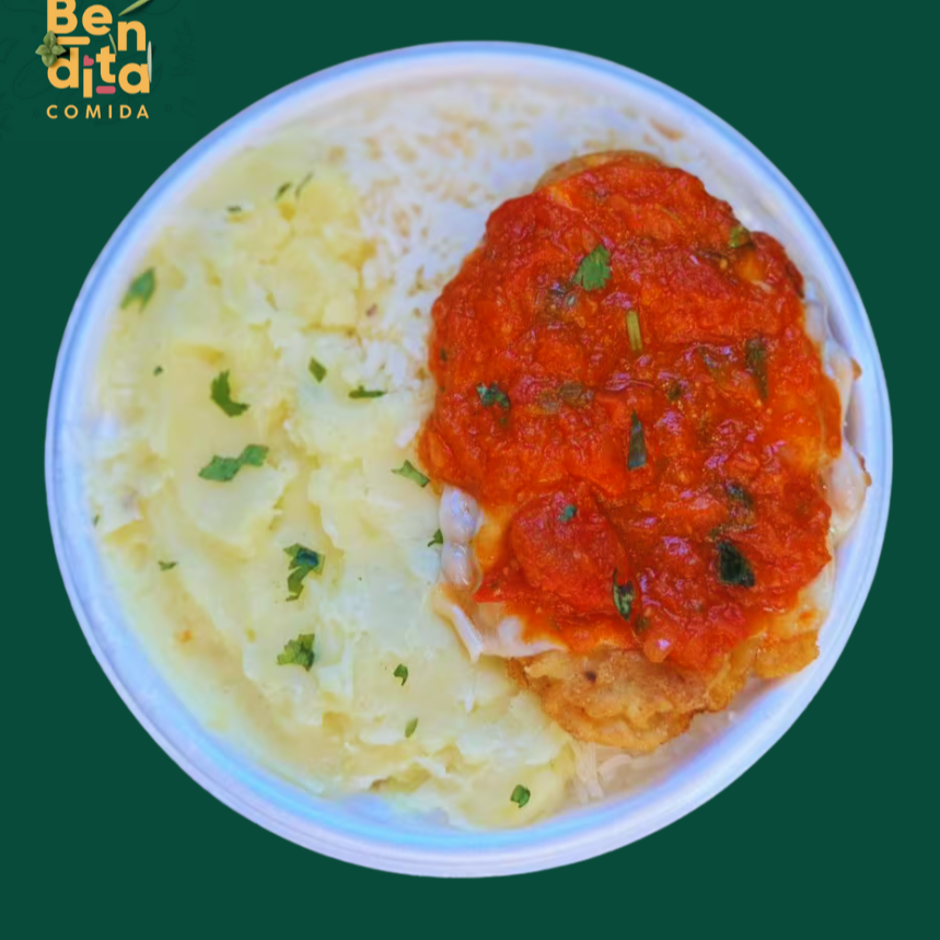Marmita com delicioso filé de frango parmegiana (empanado na massa crocante coberto com molho de tomates e queijo) acompanhado de arroz branco e purê de batatas. Marmita indicada para 01 pessoa.