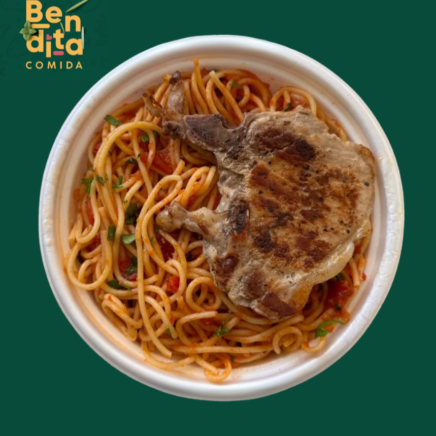 Marmita com deliciosa bisteca suína grelhada acompanhada de macarrão espaguete ao molho de tomates. Marmita indicada para 01 pessoa.