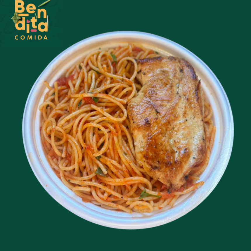 Marmita com delicioso filé de frango grelhado acompanhado de macarrão espaguete ao molho de tomates. Marmita indicada para 01 pessoa.
